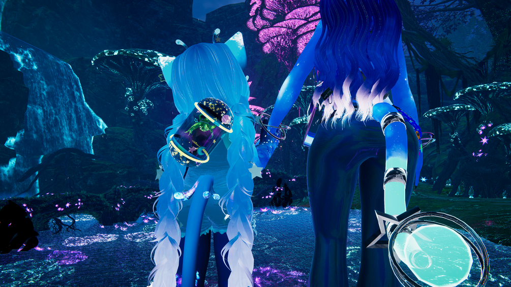 Hearplanet hairclips, Star hair accessories, Antenna and Tail Accessories, Face Stars, Glowstick Bracelets, Sailor Shirt, Pete, Tube backapack, UFO springjoint, Squishy Planet, Planet Glasses, ALL Particles, AKF, Standing Idle, Textures for PJ set, Body and face Texture (very very base was by body creator) aka all details like glowy bits, galaxy, stars etc.